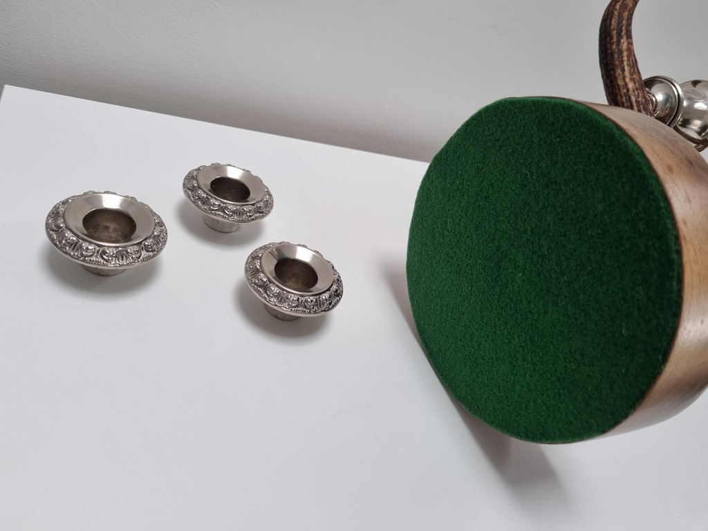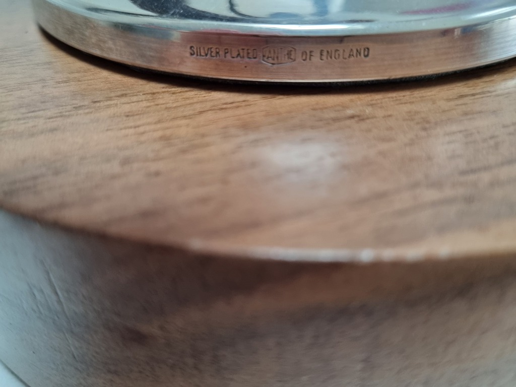 This is a collabaration of old and new with the sconces being given a new lease of life. They are silver plated dating from circa 1960 and are removable for cleaning puposes and in excellent condition. Mounted on a solid 6" x 1.5" american walnut wooden plinth with green baise to protect furniture.