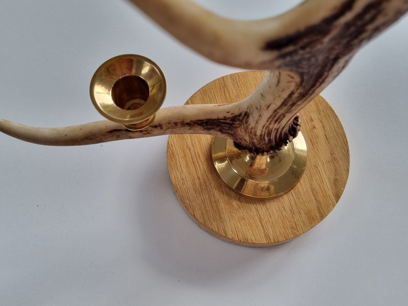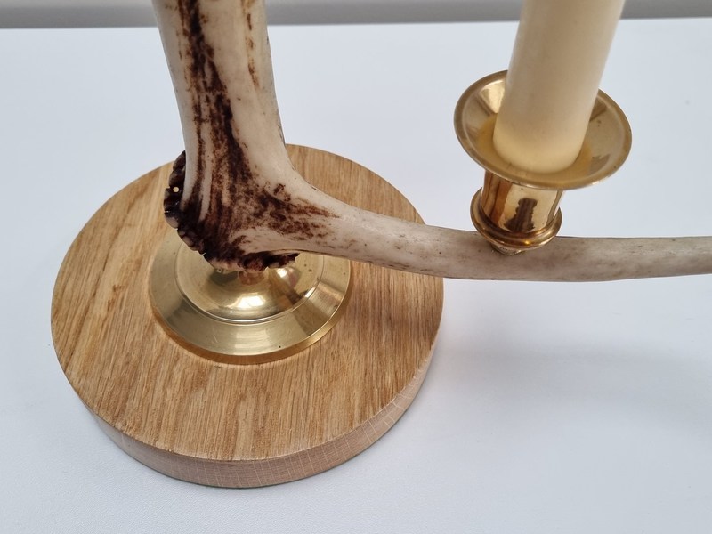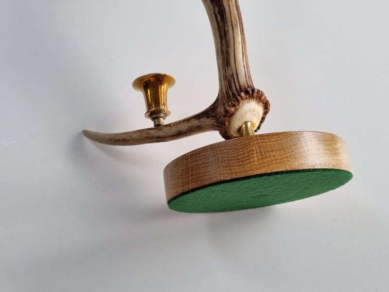 A beautifully coloured antler which pairs nicely with the antique brass sconces and base. Mounted on a solid beech plinth and green biase to protect furniture.