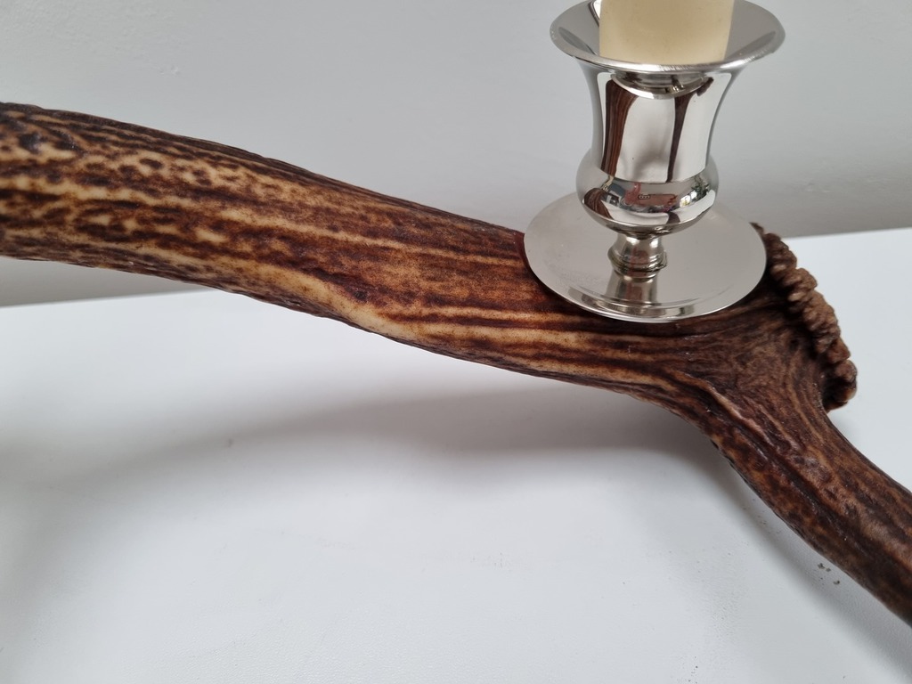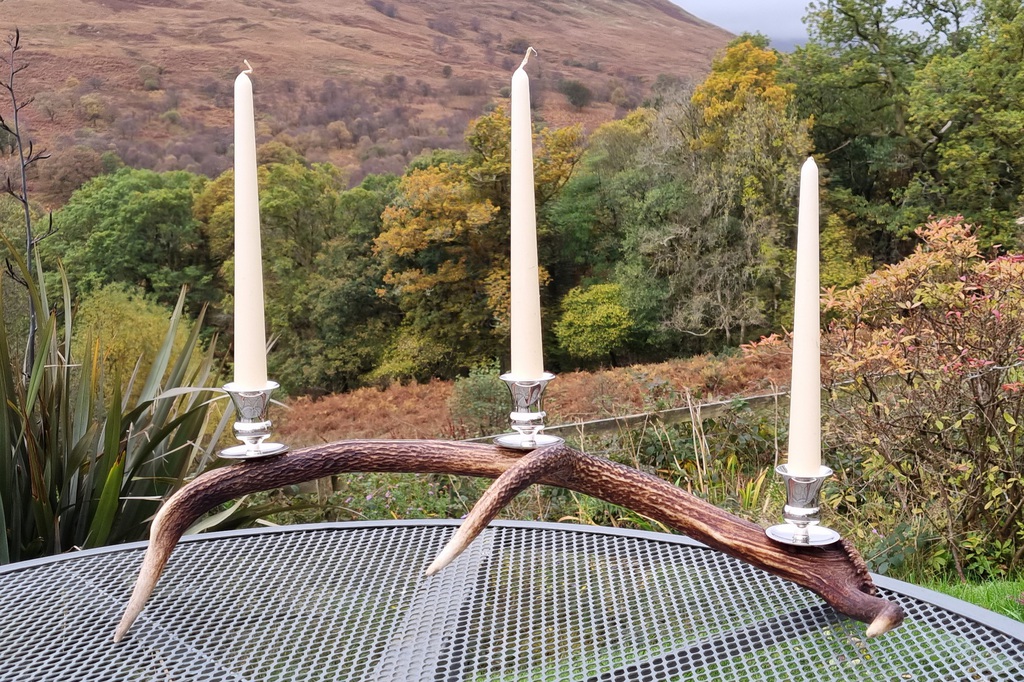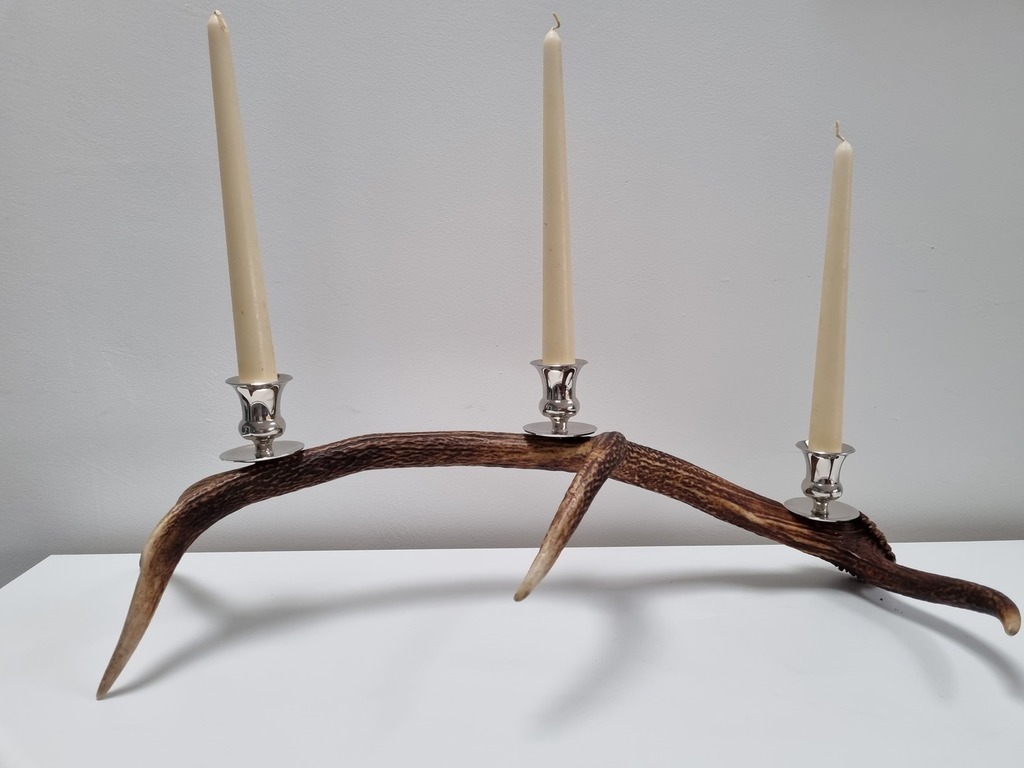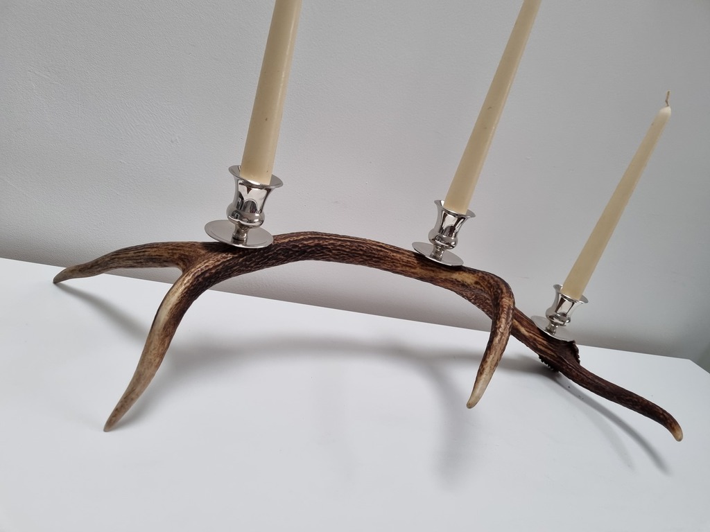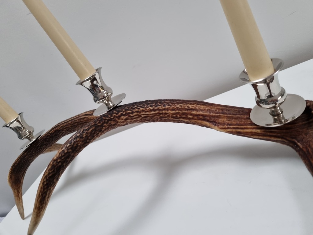 Three thistle shaped "stay bright" sconces with drip trays on this beautifully coloured stag antler.