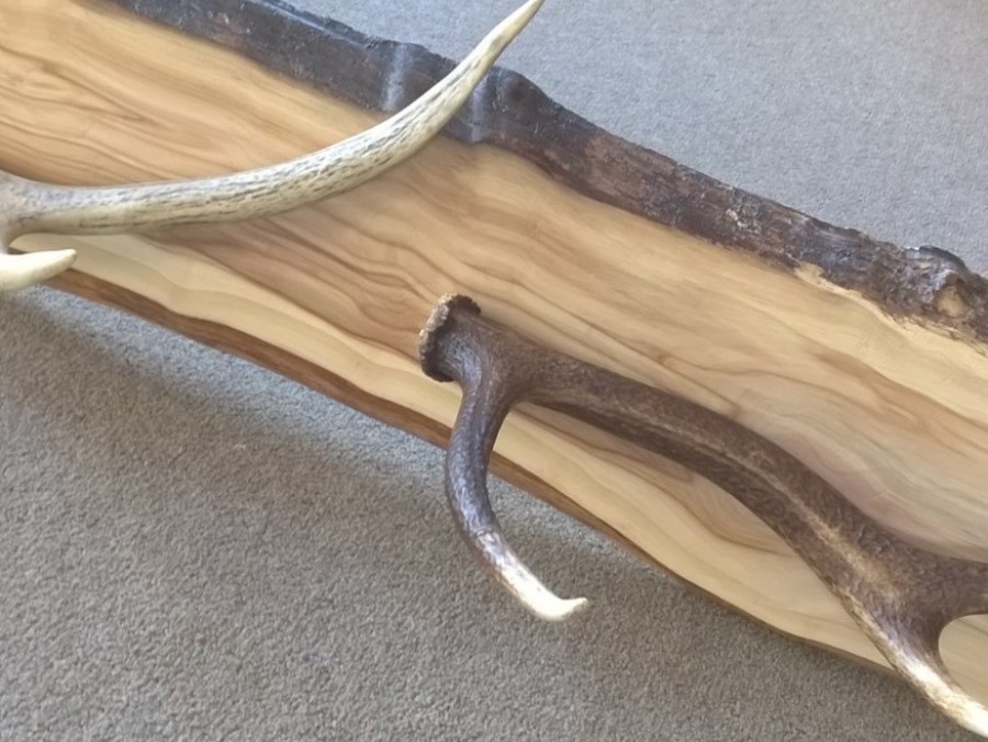 Two stag antlers mounted on a beautiful piece of Sycamore wood.