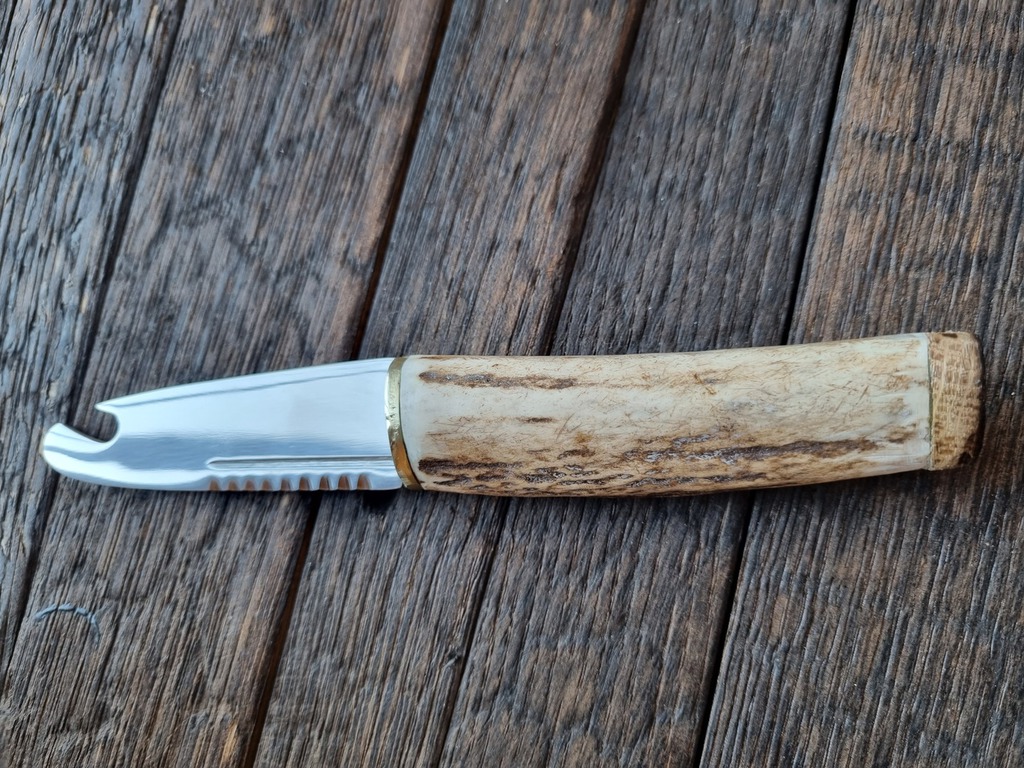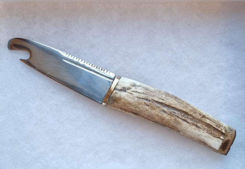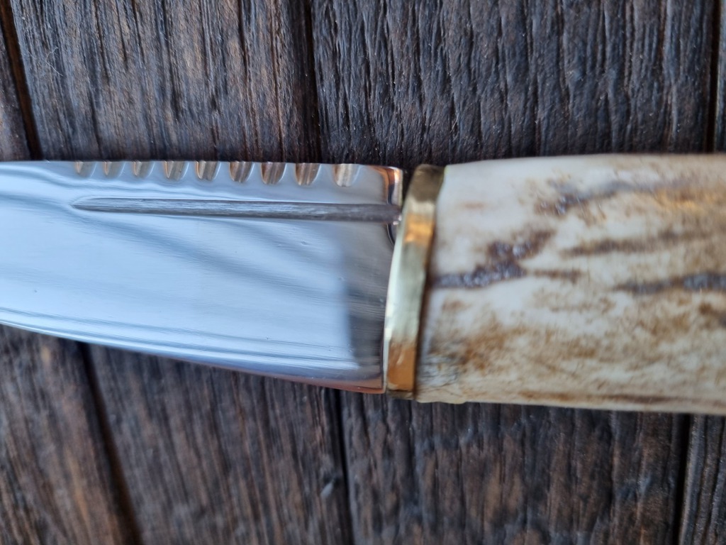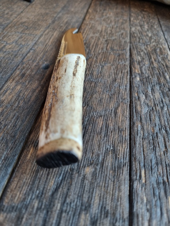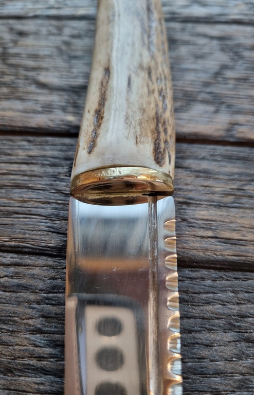 A beautifully coloured Scottish Stag Antler with carbon steel blade, poished brass hilt and recycled whisky oak cap. The whisky barrel cap still retains some residue from the