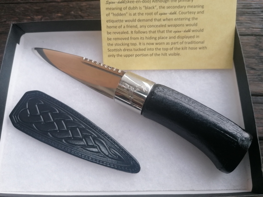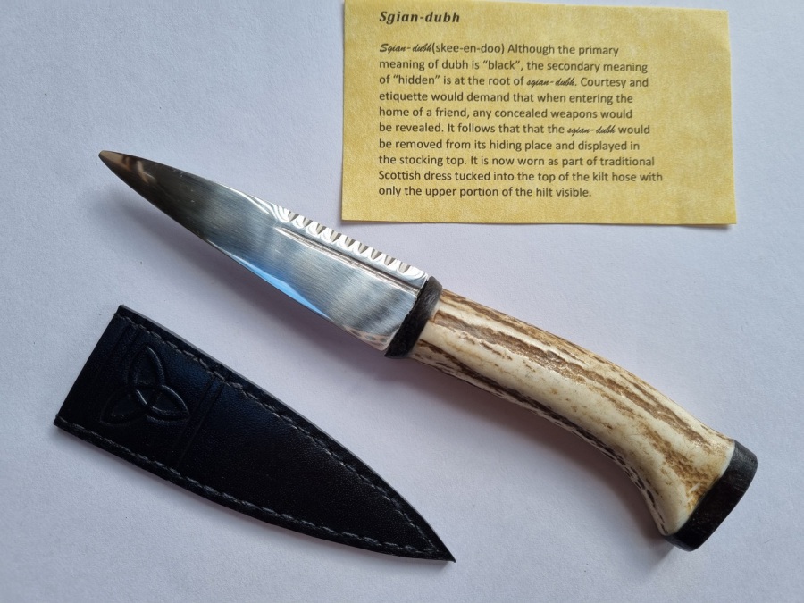 Sgian Dubh (skee-en-doo). Courtesy and etiquette would demand that when entering the home of a friend, any concealed weapons would be revealed. It follows that the sgian dubh would then be removed from it's hiding place and displayed in the stocking top.