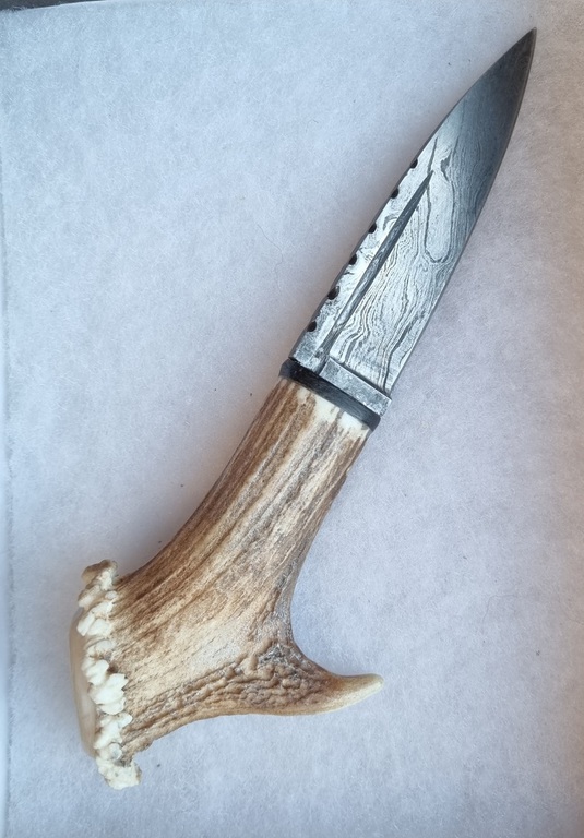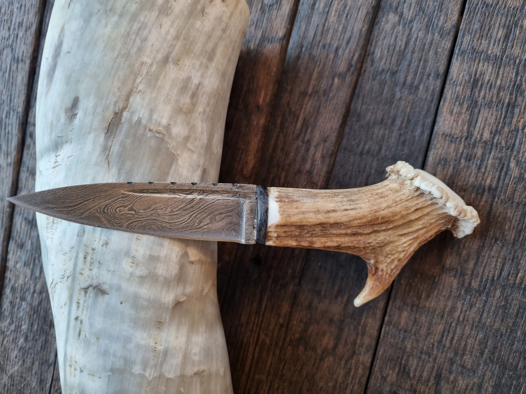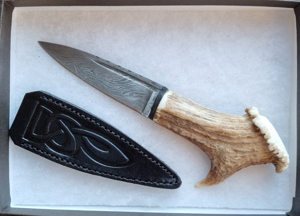 The sought after crown stag antler with its distinctive Damascus blade makes this a stand out piece. The black bog oak hilt can be carbon dated to approx 2,000 BC