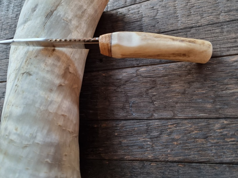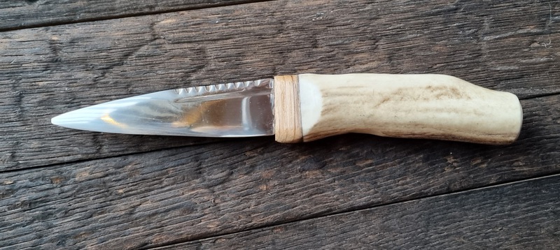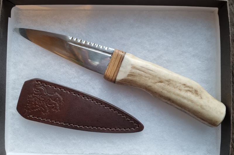 Finger indents on handle and lovely wood markings on the oak hilt. Antler has been polished to protect and enhance it. Unfortunately there is no whisky with it, although there may still be an aroma.
