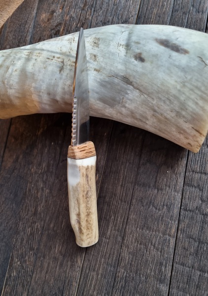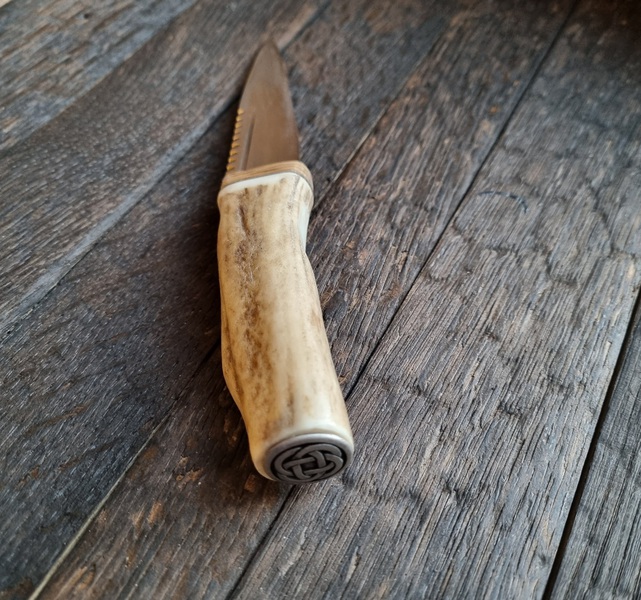 A beautifully coloured Scottish Stag antler sgian dubh, complimented by the recycled oak whisky hilt and cap with carbon steel blade.